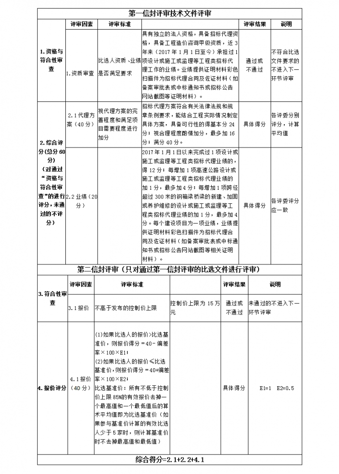 本项目成立由5人组成的评分小组,对各比选人进行评分比选。对通过资格和符合性审查的比选文件进行综合打分(评分小组全体成员有效打分的算术平均值为准)。按最终得分由高至低排出各有效比选人的名次,原则上最高得分即为中选候选人,出现最终得分并列时,按报价由低到高顺序排列。