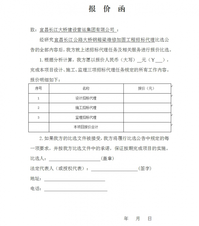 报价函,所有报价以人民币报价,并由法人代表(或授权代表)签署并加盖公章(若为授权代表签署,需要提供法人代表签署的授权书并加盖公章)。
