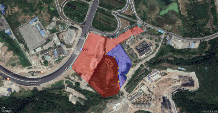 本项目位于夷陵长江大桥江南D匝道旁,地块原为经营性仓库,2018年根据市政府环境整治有关要求,该处仓库全部拆除,现该地块为拆除后未整理状态。该地块面积约55亩(下图红色部分,内含山地20亩,土地性质为划拨交通用地),旁边有未开发可利用土地11亩。