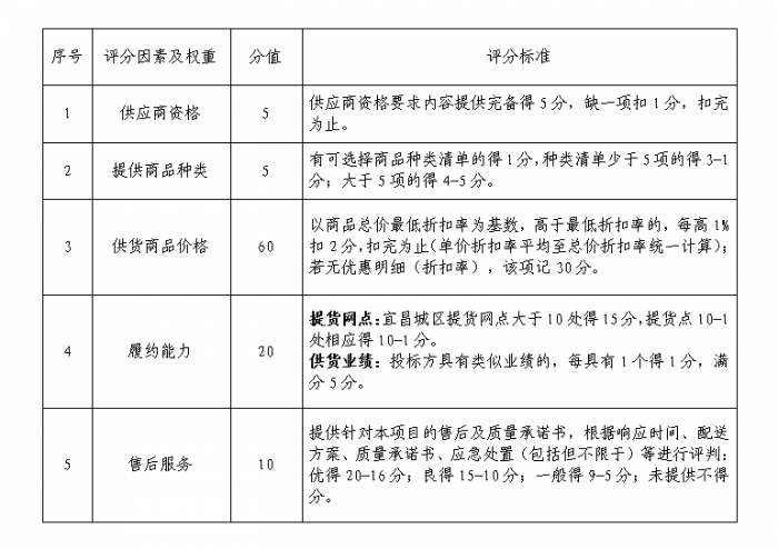 (一)评比原则:本次采购工作成立评分小组,按照商品折扣率、职工便利度、商誉程度、网点分布、商家规模等因素对各比选人进行评分议定。原则上最高得分即为中选候选人。
