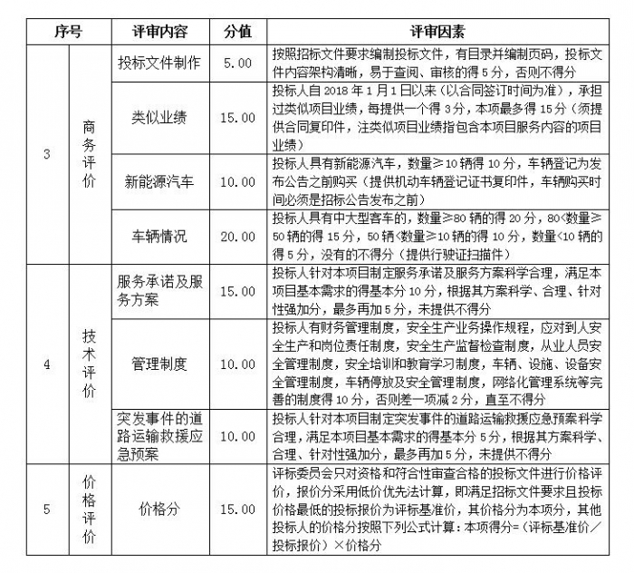 本项目比选采取综合评价方式,根据报价人企业资质、服务方案、安全保障能力、相关业绩、车辆状况、驾驶员情况、报价情况等因素进行综合评价。