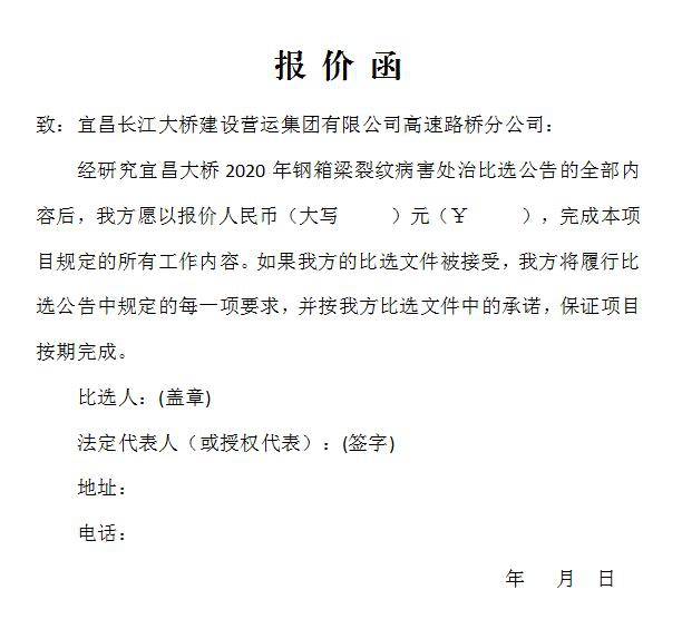 1、报价函,所有报价以人民币报价,并由法人代表(或授权代表)签署并加盖公章(若为授权代表签署,需要提供法人代表签署的授权书并加盖公章)。