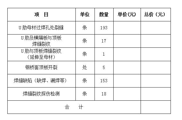 2、处理方式:U肋母材过焊孔处裂缝采用止裂孔处理,U肋及横隔板与顶板焊缝裂纹采用手工电弧焊进行处理,U肋与顶板焊缝裂纹(延伸至母材)、钢桥面顶板开裂、焊缝缺陷处理方式报价单位自定。