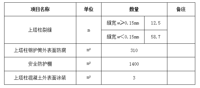 4.上塔柱混凝土外表面涂装:先人工除锈,再对涂层脱落部分涂刷环氧树脂封闭漆1道(50um/道)+环氧树脂中间漆2道(50um/道)+氟碳面漆1道(70um/道)。