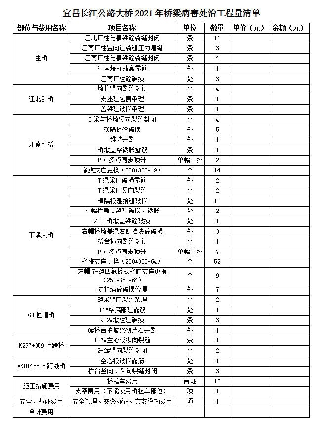 宜昌长江公路大桥2021年桥梁病害处治工程已由宜昌长江大桥建设营运集团有限公司批准,已具备询价条件,现就该项目进行公开询价。