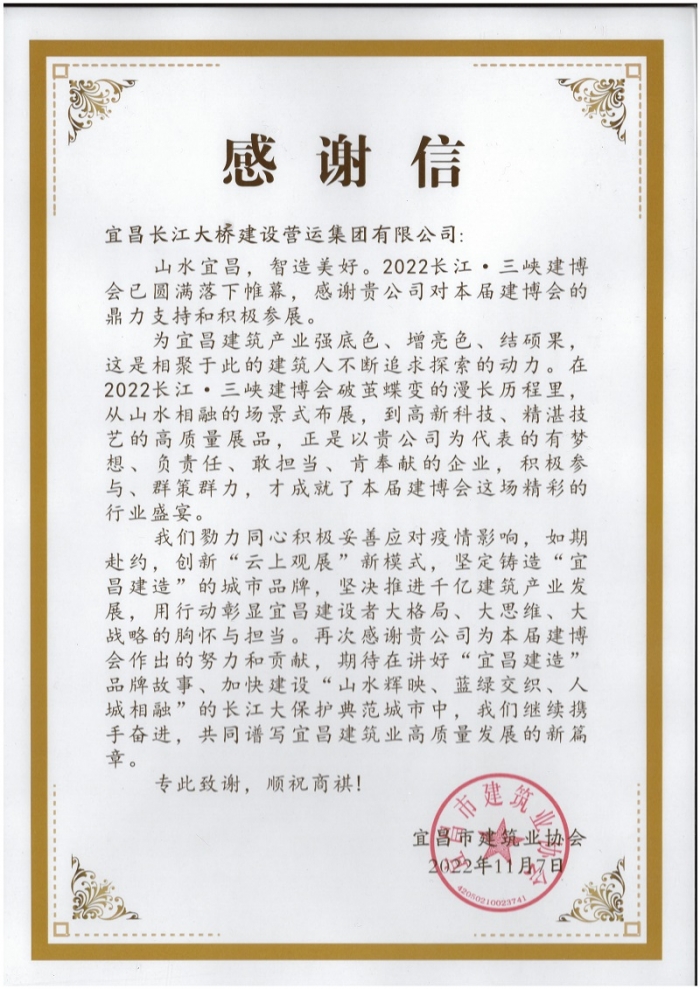 “感谢您们的鼎力支持,本届三峡建博会取得了圆满成功!”11月7日,2022长江·三峡建博会顺利闭幕后,宜昌市建筑业协会相关负责人将一封精心装裱的感谢信,送到了城市桥梁分公司养护机电人员手中。